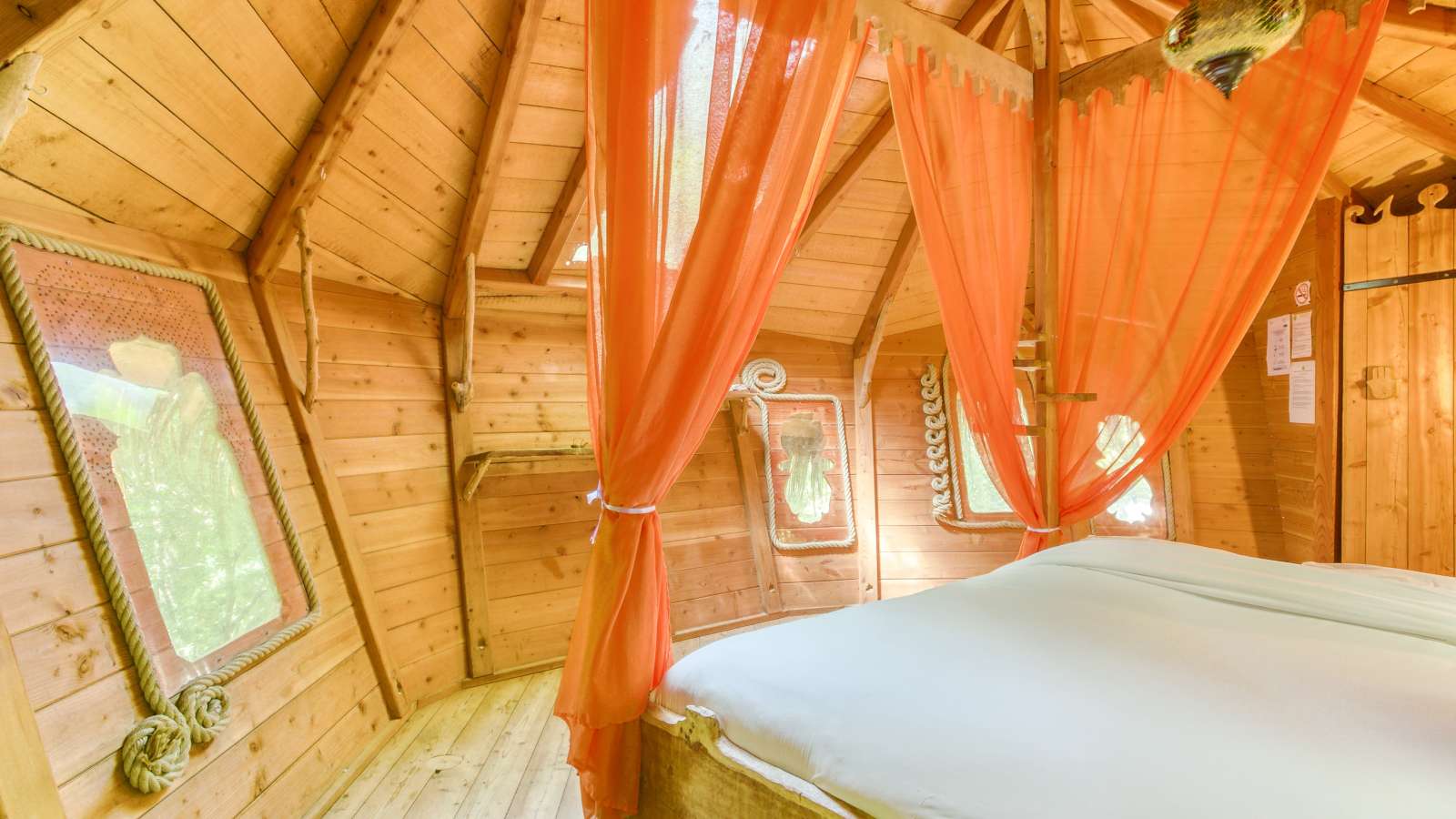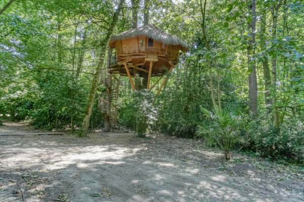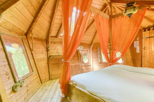 Have you ever dreamed of sleeping in a tree house? This unusual experience is now possible in Pons, on the magnificent site of the Château d'Usson (Le Château des Énigmes/ The Castle of riddles). Five huts await you for a magical night, suspended between heaven and earth. Our cabins are perched between 5 and 11 metres high and can accommodate both young and old adventurers. Three "couple" cabins will allow you to spend a romantic night together, lulled by the rustling of the leaves. Two "family" cabins welcome families of up to five people and children from two years old. The huts are without water but equipped with electricity and dry toilets. In the morning, your breakfast will be placed at the foot of your tree, and all you have to do is hoist it up and enjoy it on your terrace, while admiring the morning ballet of the squirrels. A bathroom is available in the castle and toilet blocks with shower facilities are available 24 hours a day. An original adventure, in the heart of nature, ideal for strengthening ties, as a couple or as a family! We offer a hearty picnic basket that will delight young and old alike. All our baskets are prepared by us with a selection of local products. Good plan: the entrance fees for the game courses of the Château des Énigmes are at a preferential rate for all our guests in the hut! The tree houses were awarded the Grand Prix Charente-Maritime du Développement Durable (Charente-Maritime Grand Prix for Sustainable Development) in 2013. The Thousand and One Nights Hut is a small oriental palace suspended 7m high in a double-trunk oak tree. It is hidden in the woods of the Château d'Usson park and is perfect for a romantic getaway for a night or two. It is our most spacious cabin for couples. It is ideal for a cocooning evening under the canopy.